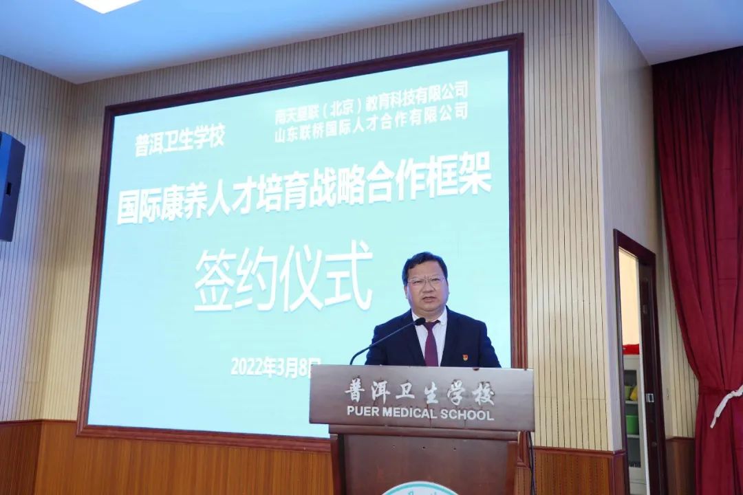 为认真贯彻落实产教融合、校企合作,提高人才培养质量,服务地方经济社会发展,3月8日,普洱卫生学校与南天星联(北京)教育科技有限公司、山东联桥国际人才合作有限公司签订国际康养人才培育战略合作框架协议。普洱卫生学校党委书记何荣青,党委副书记、校长鲁明云等党政工领导班子、南天星联(北京)教育科技有限公司云南区总经理杨帆、区域经理赵宇出席签约仪式并讲话。南天星联(北京)教育科技有限公司总经理助理孙强,普洱卫生学校各科室负责人及有关工作人员、各班班主任参加签约仪式。